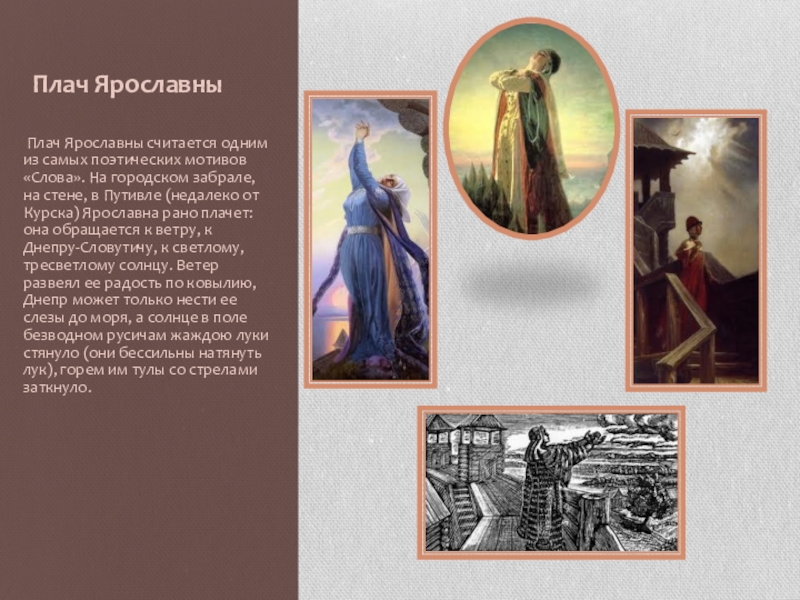 Так за всех, кто из чужого края Милых ждет, вздыхая в тишине, Плачет Ярославна, причитая На Путивльской городской стене. — Ветер, ветер, почему, могучий, Ты забыл старинное родство, Вражьих стрел зачем ты мечешь тучи На дружину князя моего!