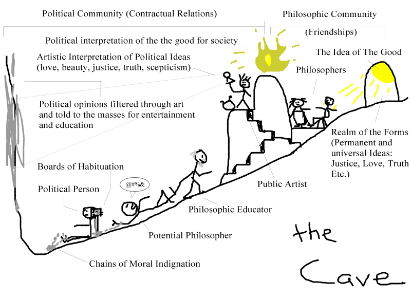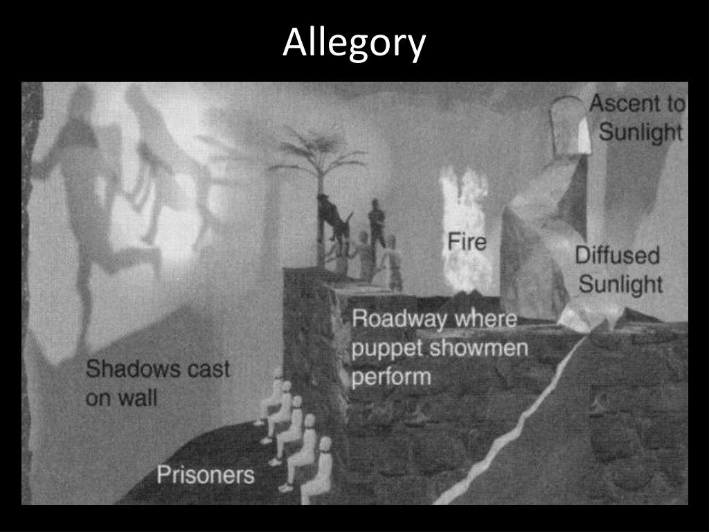 В «Мифе о пещере» Сократ обращается с рядом вопросов к Главкону, пытаясь объяснить, что мир, в котором мы живем, есть мир иллюзий и теней — простое отражение реального мира интеллект» (Миллер). Он использует символизм или аллегорию в своем диалоге, чтобы показать тьму нашего греха по сравнению со светом спасения.