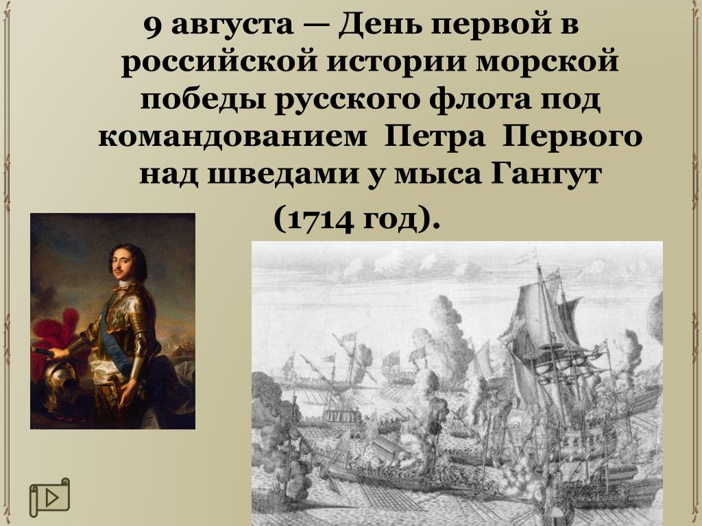 Первая в истории России морская победа над шведским флотом при Гангуте (полуостров Ханко, Финляндия), Балтийское море, 9 августа 1714 г.