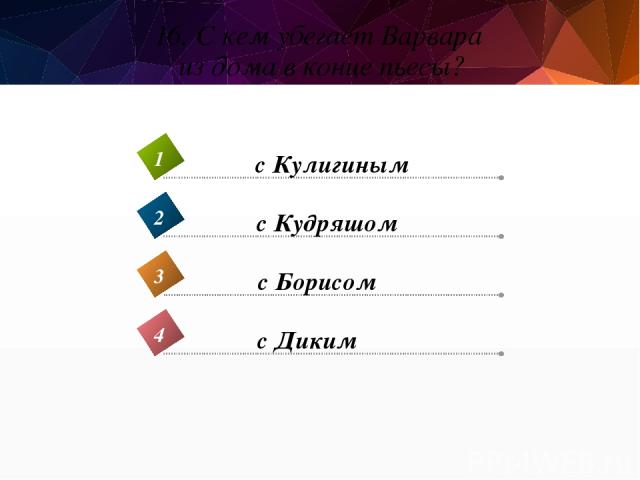 Кудряш и Варвара Кабанова тайно встречаются за спиной у Кабанихи, матери Варвары. В конце пьесы Варвара убегает с Кудряшом из дома.