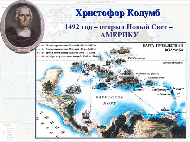 1.Стремясь открыть морской путь в Индию, Христофор Колумб пересёк в 1492 году Атлантический океан и открыл острова, которые сейчас называются Большие Антильские. За первой экспедицией последовала вторая, потом третья. Маршрут третьей экспедиции (1498год) лежал к северному побережью Южной Америки и дельте реки Ориноко. Болезнь помешала Христофору Колумбу подробнее исследовать эти новые земли.