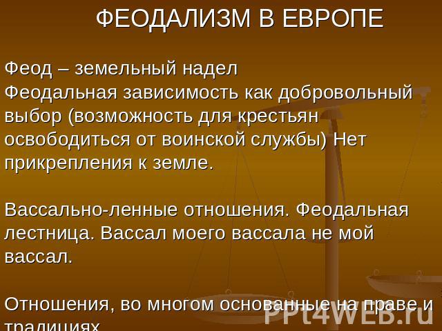 Принимая феод от сеньора, рыцарь давал вассальную клятву. Клятва верности вассала и ответ на нее сеньора устанавливали личную связь чести между двумя рыцарями. Дух рыцарской морали пронизывал вассальные отношения. Преданность вассала своему сеньору, готовность сражаться и погибнуть за него расценивались как наиболее высокие добродетели.