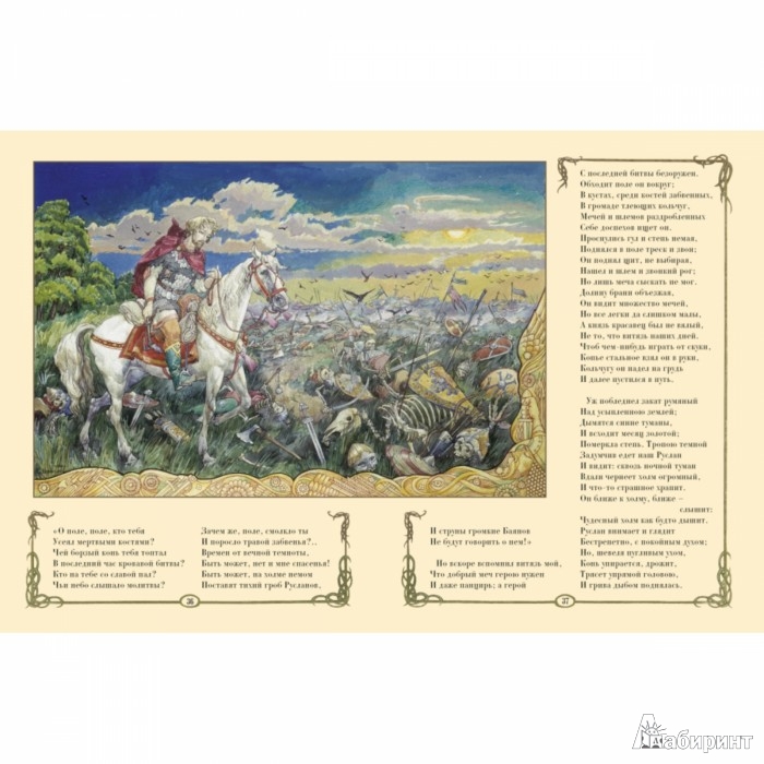 В этот момент читатель думает, что, возможно, один из соперников вот-вот украдёт красавицу прямо со свадебного пира, но дело обстоит ещё хуже: когда праздник закончится и новоиспечённые муж и жена отправятся ночевать, Людмилу похитит злобный колдун Черномор… Отец же несчастной девушки, тот самый Владимир Красно Солнышко, обратится к славным воинам с такой речью:
