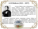 Краткая биография А.Н.МайковаАполлон Николаевич Майков родился в Москве 4 июня (23 мая по старому стилю) 1821 года. Отец Аполлона Майкова — Николай Аполлонович Майков — был талантливы художником, достигшим звания академика живописи, а мать, Евгения Петровна, писала книги. Художественная атмосфера родительского дома способствовала формированию духовных интересов мальчика, который рано начал рисовать и писать стихи. Его учителем словесности был писатель И.А.Гончаров. Двенадцатилетним подростком отвезли Майкова в Петербург, куда вскоре переехала вся семья.