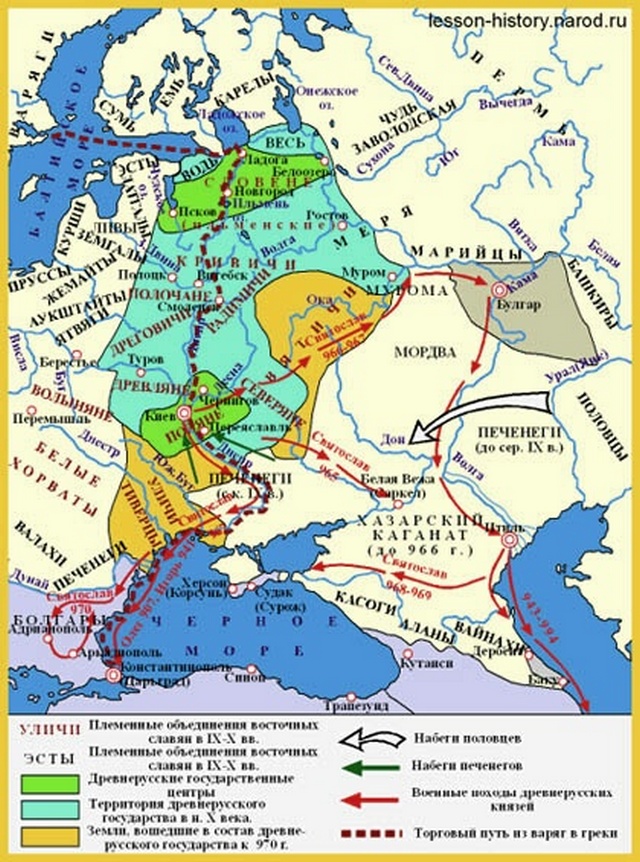 Кроме того, они, являясь крупнейшим соперником Византии в торговых делах, мешали русско-византийской торговле — основе всех торговых предприятий Руси на пути «Из варяг в греки». Все это должно было толкать правителей Киевской Руси на войны с хазарами. Такие войны и шли с переменным успехом при Олеге и Игоре.