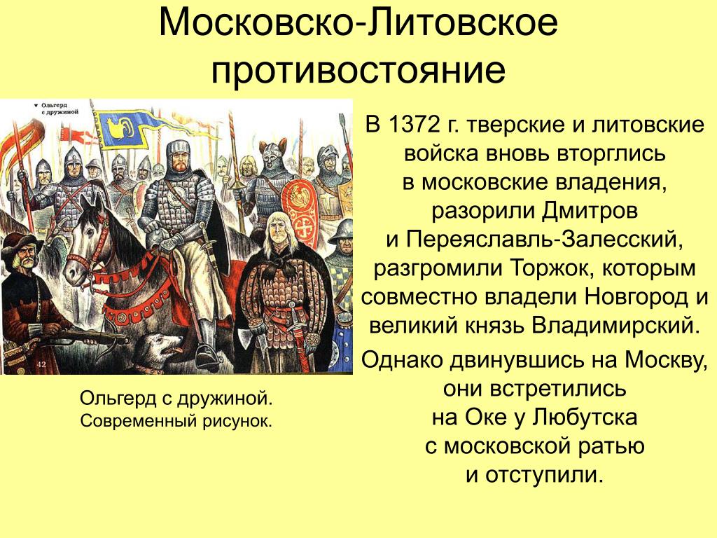 борьбу ВКЛ с Тевтонским орденом, вскоре состоялся 2-й поход Ольгерда: в нояб. 1370 литов. правитель в сопровождении вел. кн. тверского Михаила Александровича и вел. кн. смоленского Святослава Ивановича подошёл к границам Моск. кн-ва с запада. После неудачной осады Волока (Ламского) войска Ольгерда 6.12.1370 подступили к Москве и начали осаду Кремля, оборону которого возглавил вел. кн. Дмитрий Иванович. Одновременно в Перемышле, южнее Москвы, находился серпуховский кн. Владимир Андреевич с войском, к которому вскоре присоединился вел. кн. пронский Владимир Ярославич с рязанской «ратью». Это заставило Ольгерда заключить 14 дек. перемирие с вел. кн. Дмитрием Ивановичем (зимой 1371/72 скреплено браком дочери литов. князя Елены Ольгердовны и серпуховского кн. Владимира Андреевича) и уйти в ВКЛ.