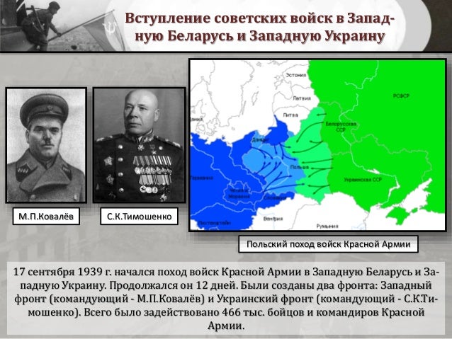Советская масса хлынула в Польшу двумя фронтами – Украиной и Белоруссией. Учитывая тот факт, что между Польшей и Советским Союзом не было объявлено войны, польский главнокомандующий маршал Эдуард Рыдз-Смиглы приказал польским войскам не вступать в бой с Советским Союзом, если они не будут атакованы напрямую. Однако некоторые подразделения не получили этого приказа, и последовало множество вооруженных столкновений. Хотя советская армия быстро продвинулась вперед, захватив 19 сентября польский город Вильно (ныне Вильнюс в Литве).и Львове 22 сентября, она встретила ожесточенное сопротивление в городе Гродно. Одна заметная победа была одержана польской стороной в битве при Шацке (ныне Шацк на Украине).