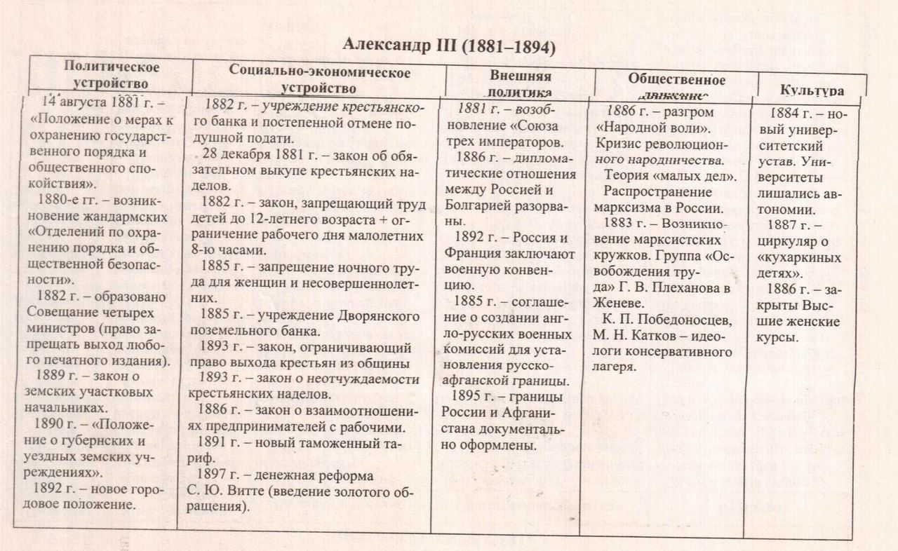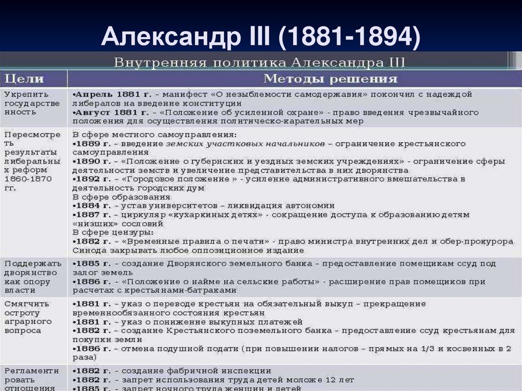 | 1861, 19 февраля | Крестьянская реформа Александра II | Отмена крепостного права. Освобождение крестьян с землёй за выкуп, вносимый помещику казной. Эта выкупная сумма потом возвращалась крестьянами государству с рассрочкой на 49 лет («выкупные платежи»). Полученная земля переходила не в личную собственность крестьян, а в общинное владение – порядок, который изменила позже лишь аграрная реформа Столыпина. |