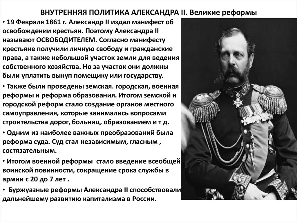 Внутренняя политика Александра 2-го разительно отличалась от политики Николая 1-го и ознаменовалась множеством реформ. Важнейшей из них стала крестьянская реформа Александра 2-го, по которой в 1861 г., 19 февраля, было отменено крепостное право. Эта реформа вызвала настоятельную необходимость дальнейшего изменения многих российских институтов и повлекла за собой проведение Александром 2-м буржуазных реформ.