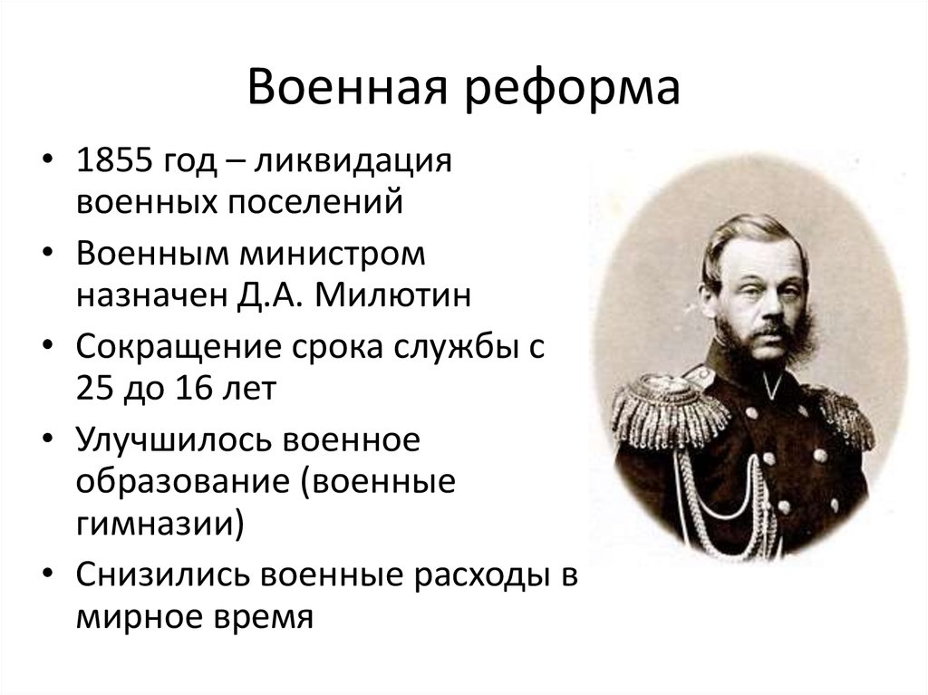 Следующей стала военная реформа Александра 2-го. Ее результат — всеобщая воинская повинность, а также близкие к европейским стандарты организации армии. В ходе проведения финансовой реформы Александра 2-го был создан Государственный банк, произошло зарождение официальной бухгалтерии. Логическим завершением реформаторской деятельности явилась подготовка первого в российской истории официального проекта Конституции.