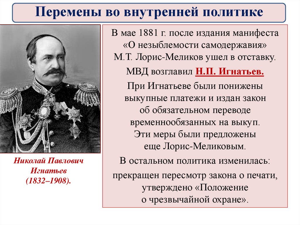 М. Лорис-Меликов в тот же день получил должность министра внутренних дел (уже без чрезвычайных прав) – и огласил программу реформ, рассчитанную на 5-7 лет. В неё входили: расширение прав земств и свободы печати, борьба со злоупотреблениями в полиции, пересмотр податной системы, преобразование правового и административного устройства крестьян. 6 августа 1880 г. было ликвидировано 3-е отделение Собственной Его Императорского Величества канцелярии – главный орган политического сыска. Лорис-Меликов настоял и на отставке главного правительственного «реакционера» – министра народного просвещения графа Д. Толстого.