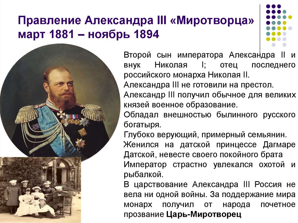 «Великие реформы» Александра 2-го были прерваны его смертью 1 марта 1881 г. В тот день царь Александр 2-й намеревался подписать проект масштабных экономических и административных реформ Лорис-Меликова. Покушение на Александра 2-го, совершенное народовольцем Гриневицким, привело к тяжелейшему ранению и смерти императора. Так завершилось правление Александра 2-го. На русский престол взошел его сын — Александр 3-й.