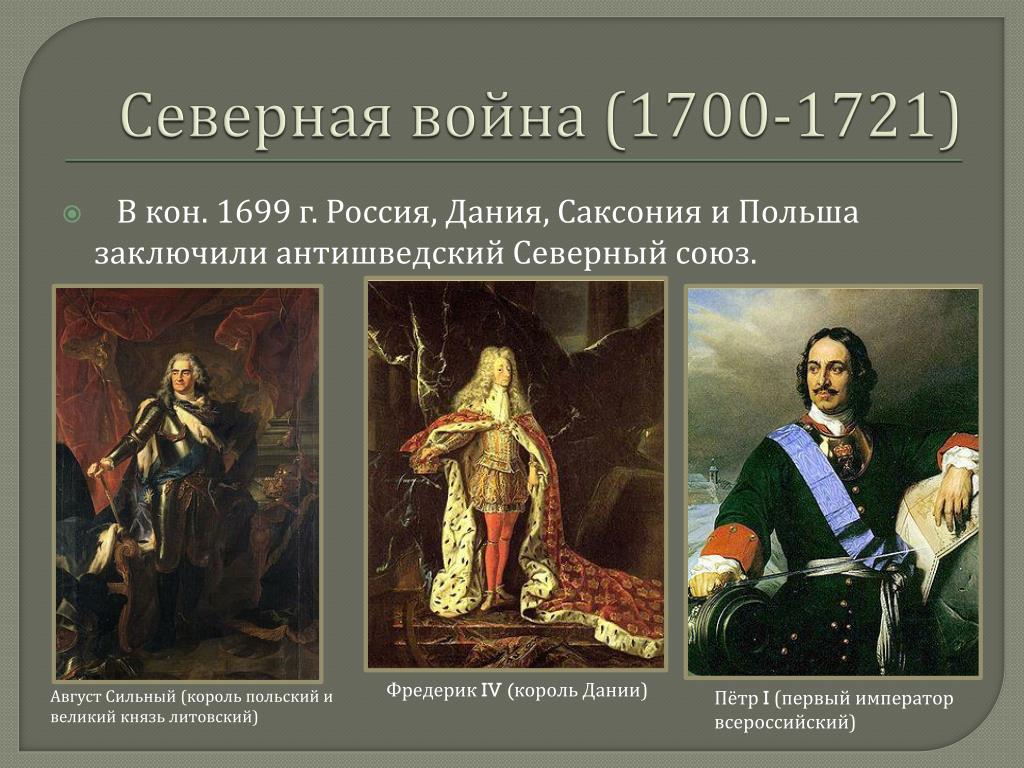 Конфликт 1700–1721 годов, в ходе которого коалиция во главе с Российским царством успешно оспаривала господство Шведской империи в Центральной, Северной и Восточной Европе. Первыми лидерами антишведского союза были Петр Великий из России, Фридрих IV из Дании-Норвегии и Август II Сильный из Саксонии-Польши.
