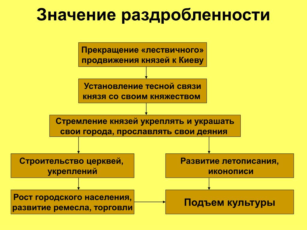 Потерявшая свое недавнее единство Русь вступила в полосу нескончаемой борьбы феодалов за земли-княжения, за укрепление своей власти и самостоятельное, независимое от киевского правления развитие своих территорий. Результатом тяжелых феодальных войн стало феодальное раздробление Руси в XII в., длившееся более 400 лет.