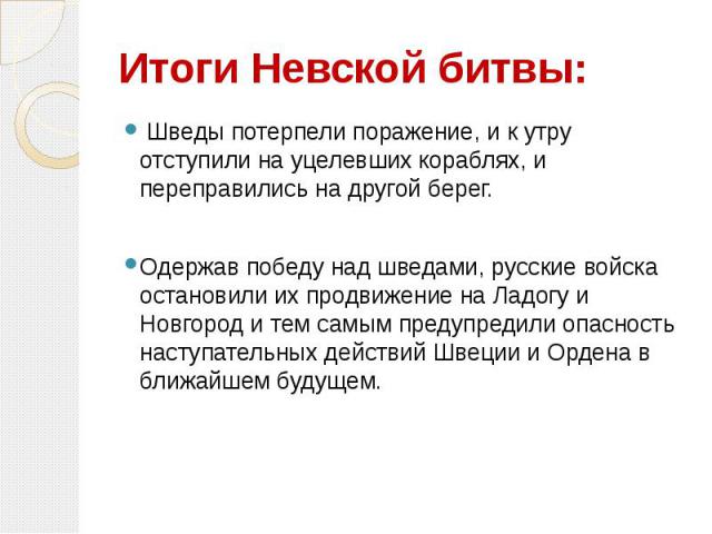 Однако, не смотря ни на что, это была первая крупная победа Александра Невского над шведскими рыцарями и она имеет важное значение в истории Руси.