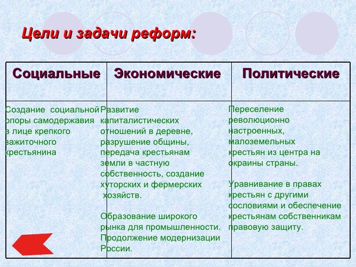 Обновления 1910 и 1911 годов снизили стоимость выезда, позволили домохозяйствам, которые не подвергались переделу за последние 50 лет, получить право собственности, позволили домохозяйствам объединяться, не выходя из коммуны, и сделали консолидацию обязательной, если 20 процентов домохозяйств коммуны желают это. Число крестьян в коммунах сократилось на 2,5 млн с 19с 05 по 1915 г. и процент земли, принадлежавшей учреждениям, с 83 до 71 процента, до начала войны изменения приостановились.