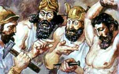 “А ты, Гефест, – сказал он богу-кузнецу, – тоже будешь наказан за то, что не уберег огонь. Ты пойдешь с ними и поможешь приковать своего друга Прометея. Не вздумай ослушаться, не то и тебя постигнет та же участь.”