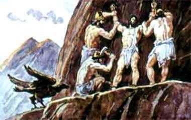 Не довольствуясь тем, что покарал человечество, Зевс (Юпитер) придумал страшное наказание для Прометея: он приказал приковать Прометея на вершине горы, к скале (на Кавказе), и орел Зевса каждый день прилетал к Титану Прометею клевать его печень и рвать когтями его тело.