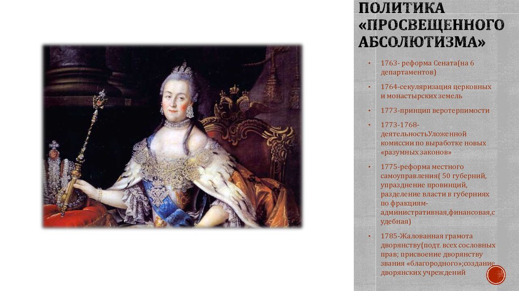 Мы уже говорили о том, что Екатерина вела политику, на-званную «Просвещенным абсолютизмом», важной частью которой стала секуляризация церковных земель, а также работа Уложенной комиссии.