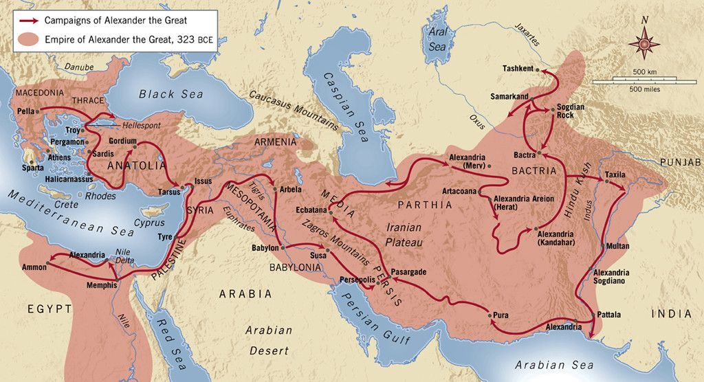 Можно, конечно, подумать, что азиатские территории как раз и хранили необходимые ресурсы, но это не так. Посмотрим на завоевательный путь Александра.