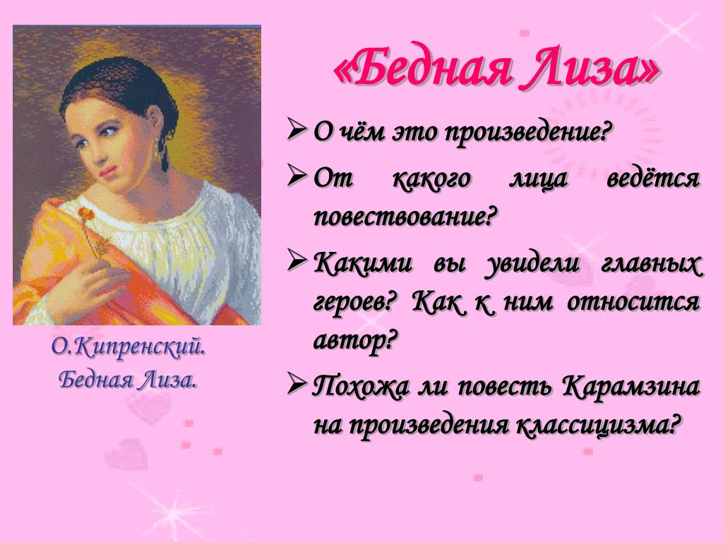 В литературе второй половины XVIII — начала XIX века очень популярным на протяжении веков было литературное направление «сентиментализм». Название происходит от французского слова «сентимент», что означает «чувство, чувствительность». Сентиментализм призывал обращать внимание на чувства, переживания, эмоции человека, то есть особое значение приобретал внутренний мир. Рассказ Н. М. Карамзина «Бедная Лиза» — это яркий пример сентиментального произведения. Сюжет рассказа очень прост. Волею судьбы встречаются избалованный дворянин и юная наивная крестьянская девушка. Она влюбляется в него и становится жертвой своих чувств.