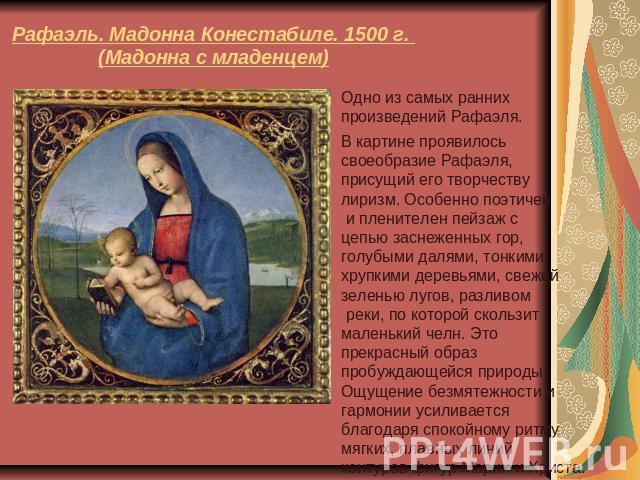 И хотя в этих произведениях еще много неуверенного, они привлекают своей наивной прелестью и поэтической чистотой. И, что самое поразительное, уже в своих первых работах юный Рафаэль обнаруживает качества художника Высокого Возрождения: гармоничность образов и классическая ясность композиции.