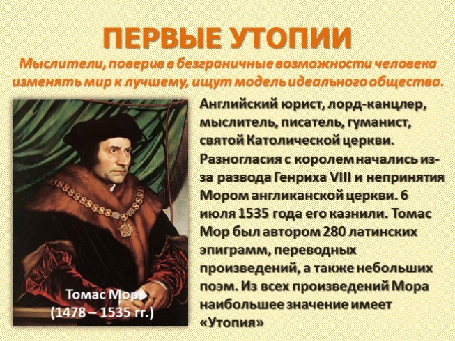 Первые утопии. В Англии идеи гуманистов, прославлявших физическую красоту и духовное совершенство человека, утверждавших его право на счастье, оказали сильное влияние на Томаса Мора (1478—1535). Этот мудрый политик и будущий первый министр короля учился в Оксфордском университете, знал несколько языков, увлекался историей, философией, литературой.