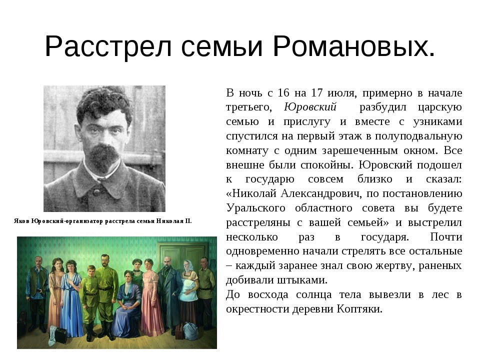 Собрав царских особ в подвале, комендант Яков Юровский, которому поручено организовать расстрел, зачитал вслух смертный приговор Уральского исполнительного комитета собравшимся царским особам и их верным слугам, все еще протирая ото сна глаза.