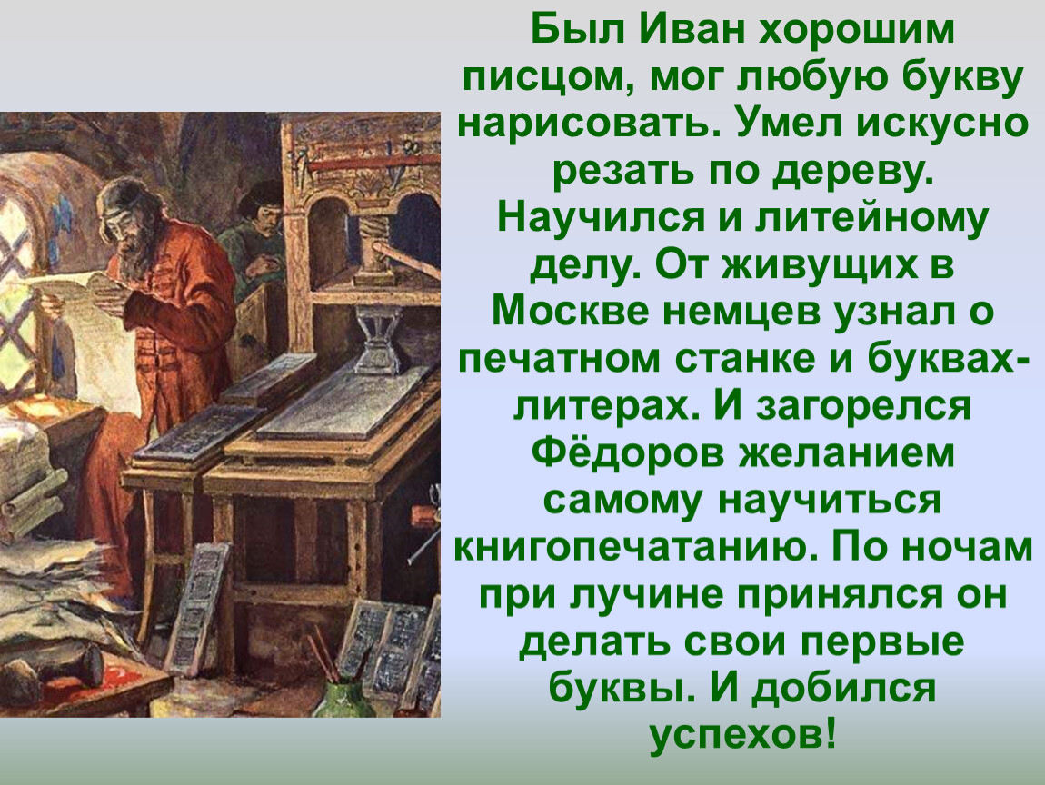 В начале XVI века люди только мечтали о том, чтобы книги были доступны всем и каждому. Процесс создания древней книги — это целое искусств. Нельзя найти двух одинаковых книг, так как каждая писалась и декорировалась вручную. Сегодня же книги стали общедоступными. Они печатаются и перепечатываются сотни раз. Любой желающий может приобрести или напечатать собственную книгу. За это мы благодарны человеку, который внедрил и развил книгопечатанье в Российском государстве. Очень важна для детей краткая биография первопечатника Ивана Федорова. Ведь именно он создал первый печатный станок и издал первую книгу на Руси.