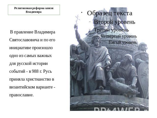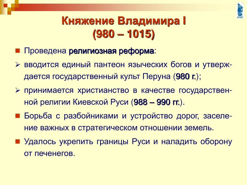 3). Ослаблялись позиции варягов-христиан, а так же новый пантеон противопоставлялся и скандинавскому язычеству. Владимир не смог бы прийти к власти без помощи варягов, и поэтому старался ослабить свою зависимость от них.