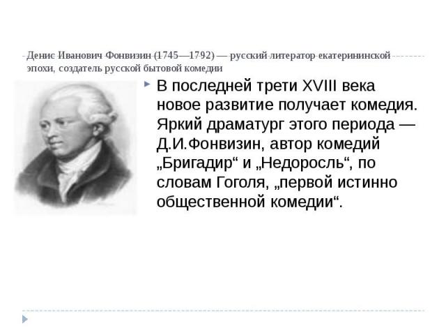 Денис Иванович Фонвизин был литератором екатерининской эпохи, публицистом, драматургом, переводчиком, создателем национальной бытовой комедии.