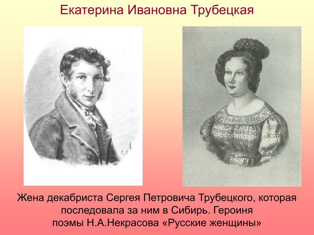 Екатерина Трубецкая первой отправилась за мужем в Сибирь. Ей было всего 25 лет. У них не было еще детей, она еще могла устроить свою жизнь по-другому. Но она поступила так, как велело ей ее сердце. Трубецкая, а за ней Мария Волконская ехали в Сибирь и не могли себе представить, что там ждало их. Дамы из высшего петербургского общества, они теперь находились вне закона, то есть власть отныне не защищала их от преступников. А преступники тогда в основном Сибирь и населяли.