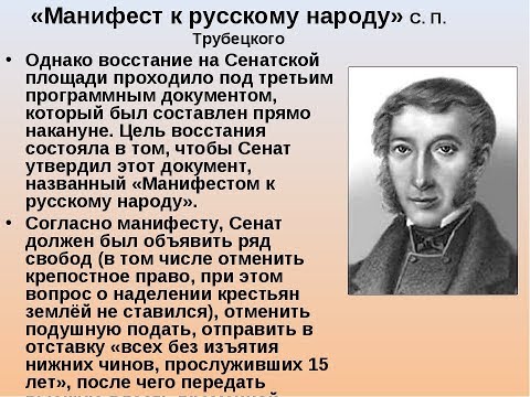 П. Трубецкой, как свидетельствуют близко знавшие его люди, был человеком серьезным, скромным, крайне сдержанным, «не лишенным способности к глубоким и сильным чувствам». Он обладал незаурядным умом. Манифест, написанный им, был подписан его рукой 13 декабря 1825 г., что говорит о том, что он надеялся на успех.