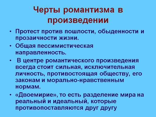 Главный признак романтизма: изображение исключительных героев в исключительных обстоятельствах. Романтизм использует яркие образы, чтобы с их помощью показать высокое назначение человека.