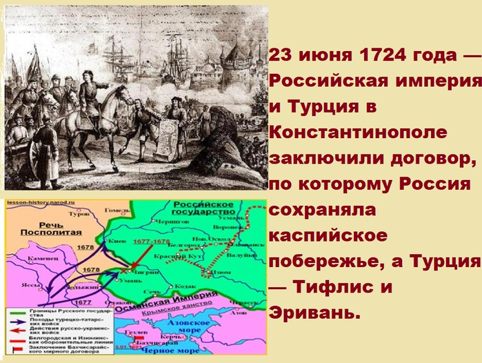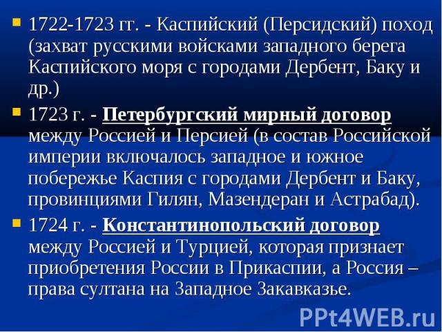 Однако Петру удалось получить выход к Каспийскому морю. Во время русско-персидской войны (1722–1723 гг.) России удалось завоевать участки территорий Сефевидского Ирана на Северном Кавказе, в Закавказье и на севере материкового Ирана, в то время как турки-османы вторглись и завоевали все иранские территории на западе. Два правительства в конце концов подписали договор 1724 года в Константинополе, разделив между собой большую часть Ирана. Присоединенные иранские земли, расположенные к востоку от слияния рек Курош (Кур) и Аракс, были отданы русским, а земли на западе достались османам.
