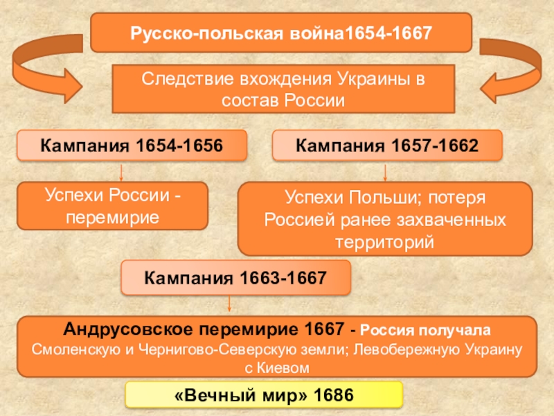 С середины 1630-х годов украинские церковники и казацкие лидеры просили Россию поддержать их восстание против Речи Посполитой. Москва сдерживалась до 1654 года, когда Богдан Хмельницкий согласился передать Запорожское войско и принадлежащие ему территории — Киев и всю Украину к востоку от Днепра — под покровительство царя.Но большим побуждением к военному вмешательству стала возможность вернуть Смоленск. Андрусовский мирный договор, положивший конец Тринадцатилетней войне (1654–1667), разделил Украину вдоль Днепра и вернул Смоленскую область России. Это была последняя великая война между Россией и Содружеством, в значительной степени из-за растущей опасности для обоих со стороны Османской империи; оба подписали «вечный мир» в 1686 году.