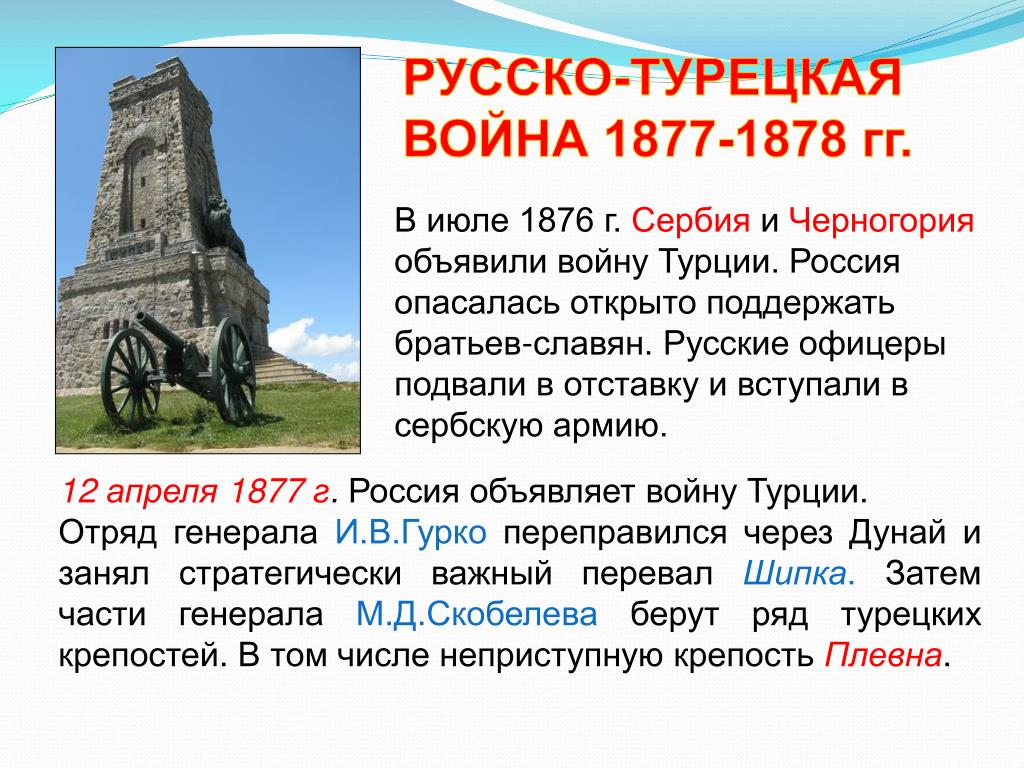 Турция после неоднократных ультиматумов со стороны великих держав на официальном уровне согласилась их принять и провести реформы, которые облегчили бы положение христианского населения Балканского полуострова. Но де-факто это не было воплощено в жизнь. Напротив, чувствуя поддержку со стороны Великобритании и Франции, официальный Стамбул усиливал гнёт и ещё более жестоко подавлял любые попытки инакомыслия. В «Русском вестнике» в преддверии начала боевых действий отставной полковник кавалерии, военный историк и журналист А.Л. Зиссерман в апрельских военно-исторических очерках 1877 года писал: «Когда эти строки появятся на страницах Русского вестника, быть может, раздадутся уже громы битв, увлекаемая роком Турция увидит в своих владениях русскую армию, появятся известия из давно нам знакомых исторических мест — Рущук, Силистрия, Карс, Эрзерум…»5.