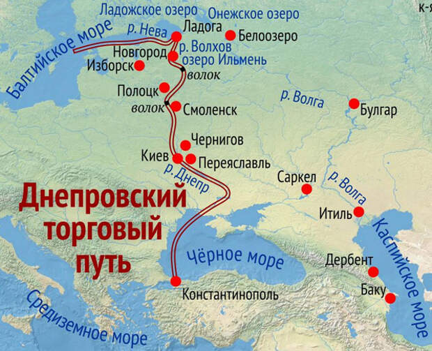 Маршрут пути «из варяг в греки…» (более 2,5 тыс. км): «Варяжское море» (Балтийское) и Финский залив — «озеро Нево» (Нева) — Ладожское озеро — Волхов — озеро Ильмень — Ловать — Днепр — Чёрное море — Царьград (Константинополь).