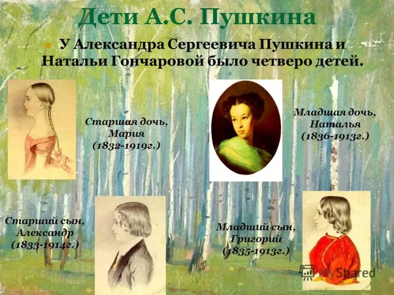 По современным понятиям семью Пушкина можно считать многодетной. У «поэта и красавицы» было четверо детей: Мария, Александр, Григорий и Наталья. «Машка, Сашка, Гришка и Наташка», – как с любовью говорил сам Пушкин.