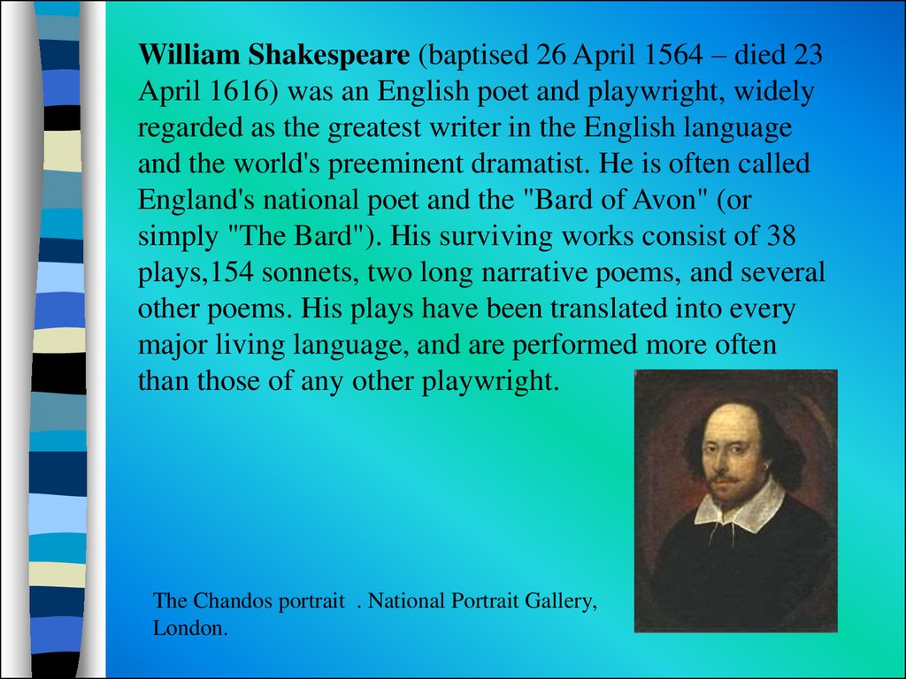 Уильям Шекспир (1564-1616) – считается самым известным английским писателем. Он написал более тридцати пьес и ста пятидесяти сонет.