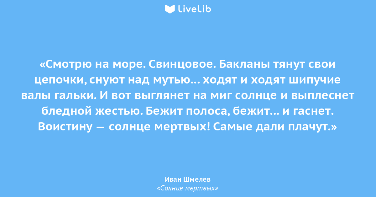 Изредка в Шмелеве проявляется лирический поэт, но его лиризм – это, если можно так сказать, написанные и описанные его кровью стоны агонизирующей родины. «Солнце мертвых» Шмелева — это не только, хотя и прежде всего, незаменимый исторический документ, как определил его Томас Манн, но и эпическое произведение великого писателя, переведенное на двенадцать языков. Необходимо также понимать, что эта книга стала для новоиспеченной советской критики чем-то вроде символа всей русской эмигрантской литературы, о чем среди прочего свидетельствует желчная статья критика Николая Смирнова «Солнце мертвых. Заметки об эмигрантской литературе».
