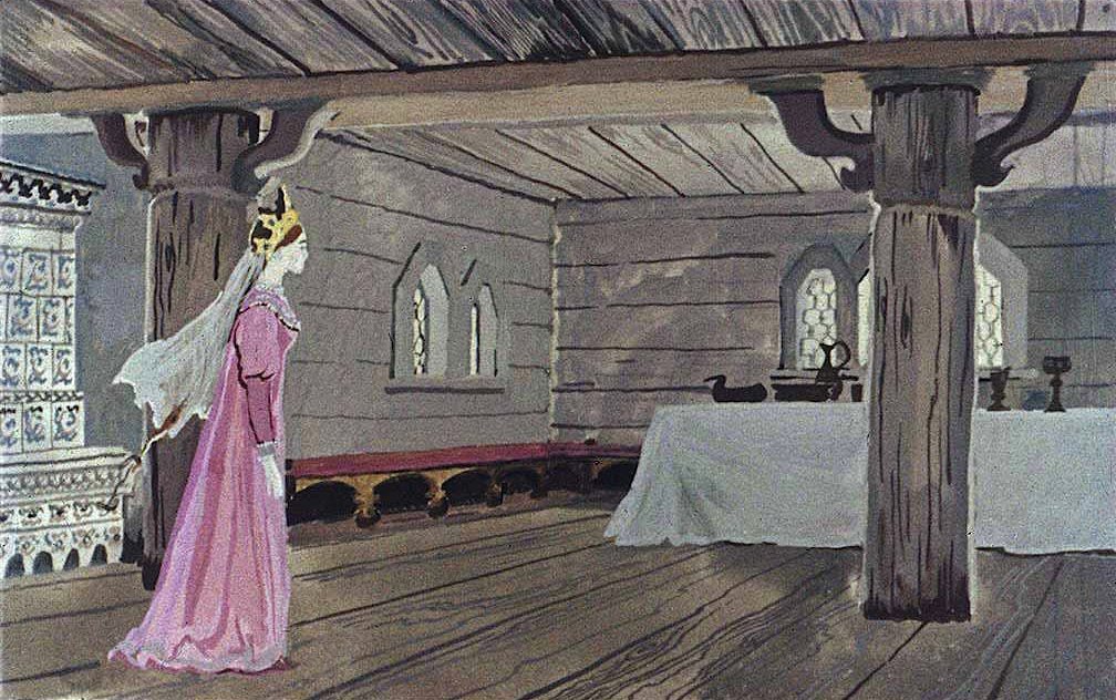 Персонажи Диснея в русском искусстве: Виктор Васнецов, Лягушка-царевна , 1900-е годы, Музей Виктора Васнецова, Москва, Россия. Царь хочет, чтобы трое его сыновей женились, поэтому он создает тест, чтобы помочь им найти невест. Царь велит каждому царевичу пустить стрелу, и по царским правилам каждый царевич найдет свою невесту там, где попадет его стрела.