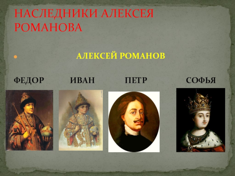 Семья императора Петра Первого. Г. Мусикийский. 1720 г.Дети от ЛопухинойПервенцем Петра стал сын его первой жены Евдокии Лопухиной несчастный царевич Алексей. Будучи втянутым в политические интриги, Алексей выступил против политики своего отца. Устрашившись его гнева, он бежал за границу. Но, обнадёженный переданным ему прощением отца, вернулся в Россию. Как оказалось, то была ловушка.
