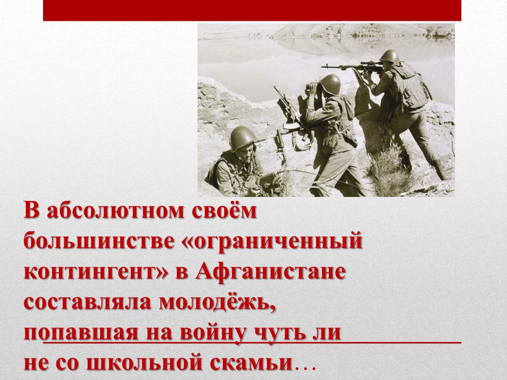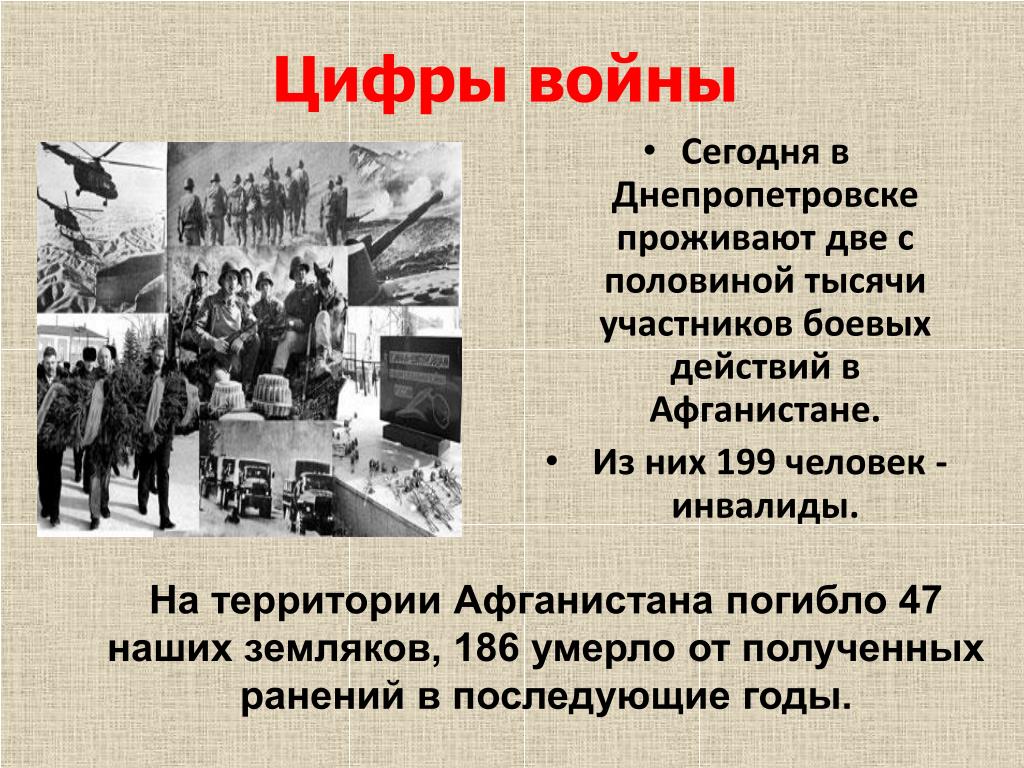 25 декабря 1979 года советские войска перешли границу Афганистана. Началась афганская война, которая длилась 9 лет, 1 месяц и 19 дней, всего 3338 дней. Через эту войну прошли более 620 тысяч советских граждан (по другим данным более 1 млн.). Они представляли практически все народы и народности, проживавшие в республиках СССР.