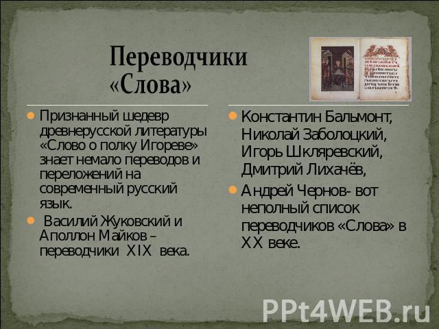 Памятник древнерусской литературы «Слово о полку Игореве» повествует об исторических событиях начала 12 века. Поэтический перевод Николая Заболоцкого превратил поэму в современное литературное произведение. Именно этот вариант «Слова…» предлагается девятиклассникам для изучения на уроках литературы.