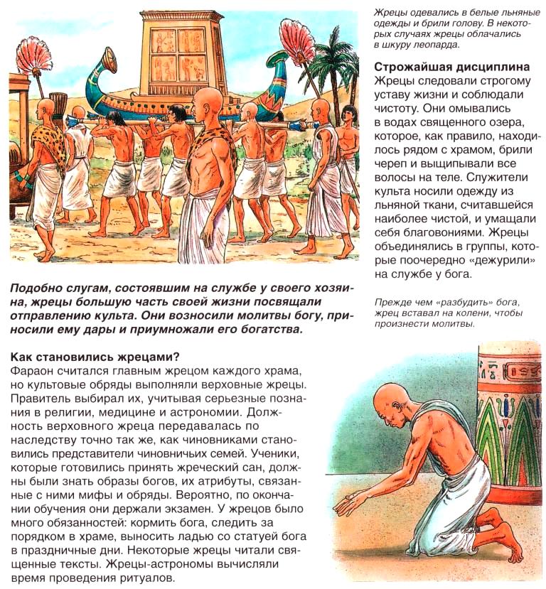 При храмах проживали жрецы — служители богов. Влияние жрецов в Египте было огромно. Многие египтяне верили, что жрецы встречаются с богами и через особые молитвы передают им просьбы людей, а боги через жрецов объявляют людям свою волю.