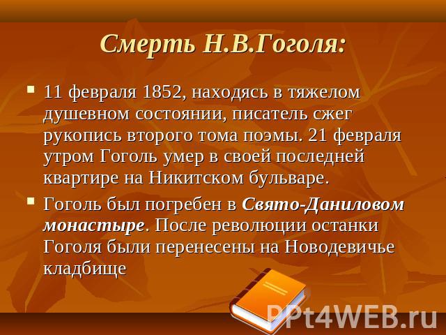21 февраля 1852 года Гоголь умер. За десять дней до смерти, в ночь с 11 на 12 февраля, он сжег ряд своих рукописей. М. Погодин в некрологе Гоголю вопрошал по поводу этого события: «Было ль это действие величайшим подвигом христианского самоотвержения… или таился в нем глубоко сокрытый плод тончайшего самообольщения, высшей духовной прелести, или, наконец, здесь действовала одна жестокая душевная болезнь?» 1Версия о том, что сожжение рукописей явилось «подвигом христианского самоотвержения», была утверждена в книгах первого биографа Гоголя П.