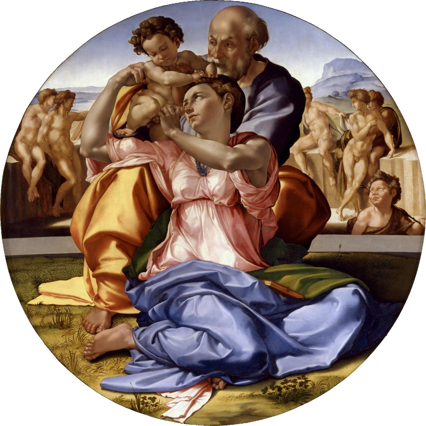 Затем нам рассказывают историю медальона Дони. Анджело Дони — богатый торговец тканями пожелал иметь у себя произведение знаменитого мастера и заказал ему медальон. Микеланджело попросил за работу семьдесят дукатов, но Анджело не готов к такой сумме. Микеланджело повысил цену работу до сотни. Анджело согласился на семьдесят, но Микеланджело еще раз повысил цену до ста сорока дукатов. Анджело понял, что чем дальше, тем больше будет цена, и вынужден был согласиться. Медальон Дони — это единственная работа Микеланджело на холсте.