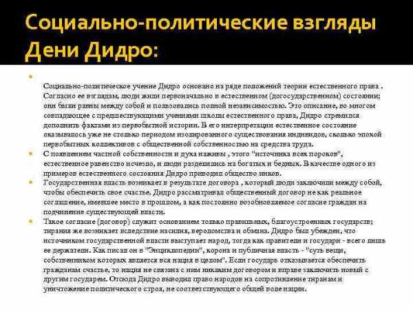 Социально-политические взгляды Дени Дидро: Социально-политическое учение Дидро основано на ряде положений теории естественного права. Согласно ее взглядам, люди жили первоначально в естественном (догосударственном) состоянии; они были равны между собой и пользовались полной независимостью. Это описание, во многом совпадающее с предшествующими учениями школы естественного права, Дидро стремился дополнить фактами из первобытной истории. В его интерпретации естественное состояние оказывалось уже не столько периодом изолированного существования индивидов, сколько эпохой первобытных коллективов с общественной собственностью на средства труда. С появлением частной собственности и духа наживы , этого «источника всех пороков», естественное равенство исчезло, и люди разделились на богатых и бедных. В качестве одного из примеров естественного состояния Дидро приводил общество инков. Государственная власть возникает в результате договора , который люди заключили между собой, чтобы обеспечить свое счастье. Дидро рассматривал общественный договор не как реальное соглашение, имевшее место в прошлом, а как постоянно возобновляемое согласие граждан на подчинение существующей власти. Такое согласие (договор) служит основанием только правильных, благоустроенных государств; тирания же возникает вследствие насилия, вероломства и обмана. Дидро был убежден, что источником государственной власти выступает народ, тогда как правители и государи — всего лишь ее держатели. Как писал он в «Энциклопедии», корона и публичная власть — «суть вещи, собственником которых является вся нация в целом». Если государь отказывается обеспечить гражданам счастье, то нация не связана с ним никаким договором и вправе заключить новый с другим государем. Отсюда Дидро выводил право народов на сопротивление тиранам и уничтожение политического строя, не соответствующего общей воле нации.
