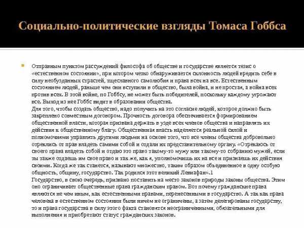 Социально-политические взгляды Томаса Гоббса Отправным пунктом рассуждений философа об обществе и государстве является тезис о «естественном состоянии» , при котором четко обнаруживается склонность людей вредить себе в силу необузданных страстей, тщеславного самолюбия и права всех на все. Естественным состоянием людей, раньше чем они вступили в общество, была война, и не простая, а война всех против всех. В этой войне, по Гоббсу, не может быть победителей, поскольку каждому угрожают все. Выход из нее Гоббс видит в образовании общества. Для того, чтобы создать общество, надо получить на это согласие людей, которое должно быть закреплено совместным договором. Прочность договора обеспечивается формированием общественной власти, которая призвана держать в узде всех членов общества и направлять их действия к общественному благу. Общественная власть наделяется реальной силой и полномочиями управлять другими людьми на основе того, что все члены общества добровольно отреклись от прав владеть самими собой и отдали их представительному органу. «Отрекаюсь от своего права владеть собой и отдаю это право такому-то мужу или такому-то собранию мужей, если ты также отдаешь им свое право и так же, как я, уполномочишь их на все и признаешь их действия своими. Когда же так станется, называют множество, таким образом объединенное в одну особую общность, общину, государство. Так родился этот великий Левиафан» . 1 Государство, в свою очередь, призвано поставить на место законов природы законы общества. Этим оно ограничивает общественные права гражданским правом. Вот почему гражданские права являются не чем иным, как естественными правами, перенесенными в государство. А так как права человека в естественном состоянии были ничем не ограничены, а затем делегированы государству, то и права государства в силу этого факта становятся неограниченными, обязательными для выполнения и приобретают статус гражданских законов.